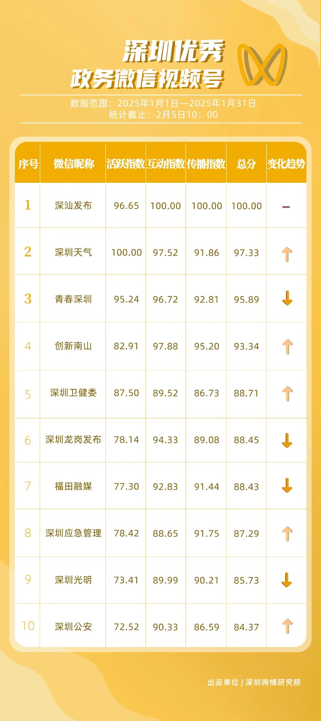 1月,獲“深圳優(yōu)秀政務(wù)微信視頻號(hào)”稱號(hào)的分別是“深汕發(fā)布”“深圳天氣”“青春深圳”“創(chuàng)新南山”“深圳衛(wèi)健委”“深圳龍崗發(fā)布”“福田融媒”“深圳應(yīng)急管理”“深圳光明”“深圳公安”。其中,“深汕發(fā)布”互動(dòng)、傳播數(shù)據(jù)較高,占據(jù)榜單首位。“深圳天氣”“青春深圳”具有較高活躍度,互動(dòng)數(shù)據(jù)良好,總分超95分,位于榜單第二、三名。“創(chuàng)新南山”“深圳衛(wèi)健委”“深圳應(yīng)急管理”“深圳公安”在排名上有所上升,彰顯了這些賬號(hào)在提升政務(wù)信息傳播效率等方面有所作為。