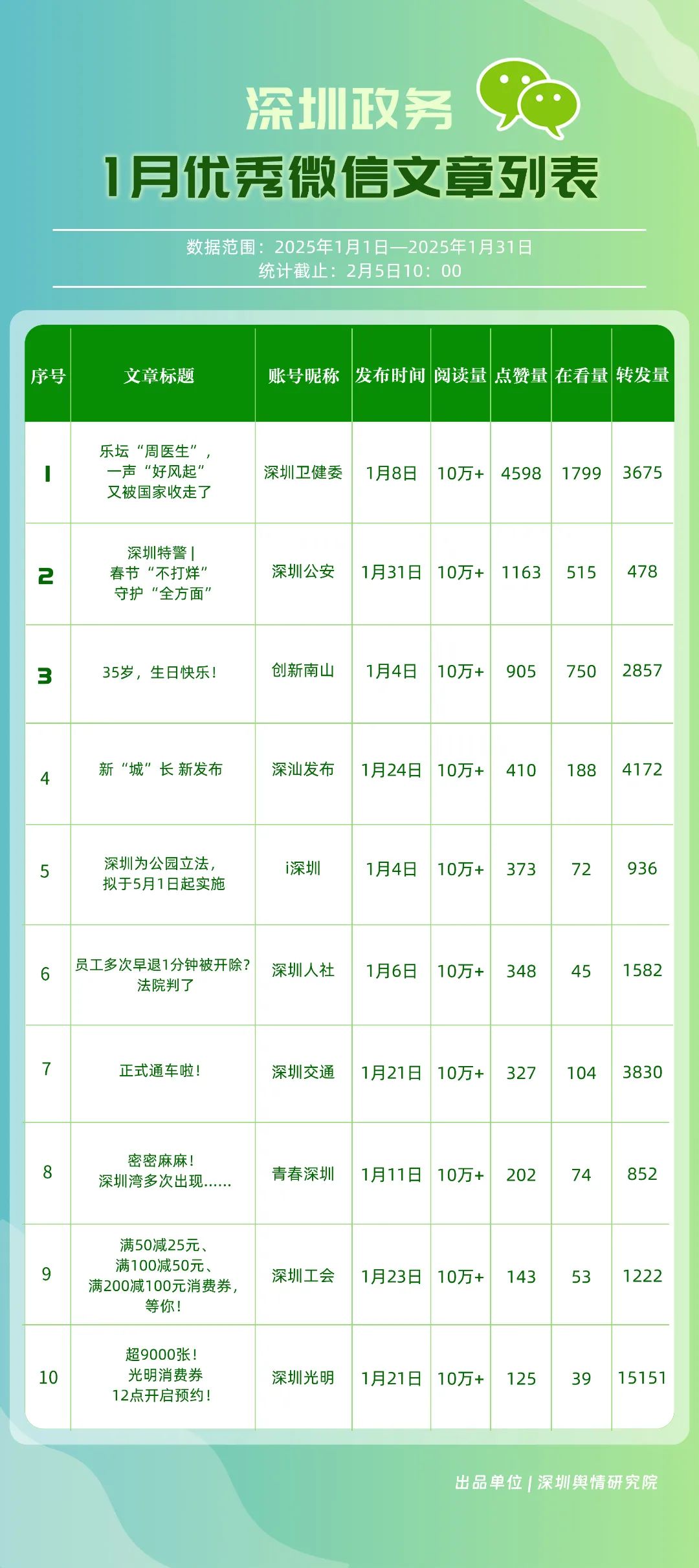 1月,“深圳衛(wèi)健委”“深圳龍崗發(fā)布”“幸福福田”“i深圳”“創(chuàng)新南山”“深圳光明”“青春深圳”“深圳工會(huì)”“羅湖發(fā)布”“濱海寶安”等30個(gè)賬號(hào)入選“深圳優(yōu)秀政務(wù)微信公眾號(hào)”。其中,“深圳衛(wèi)健委”各方面表現(xiàn)卓越,位于榜單首位,獲得總分100分。“深圳龍崗發(fā)布”“青春深圳”“深圳工會(huì)”排名在本期有所提升,反映了這些賬號(hào)在內(nèi)容創(chuàng)新與受眾互動(dòng)方面的不懈努力。“i深圳”“創(chuàng)新南山”“深圳光明”“羅湖發(fā)布”則保持了穩(wěn)健的排名,持續(xù)在政務(wù)信息的傳播中扮演著不可或缺的角色。