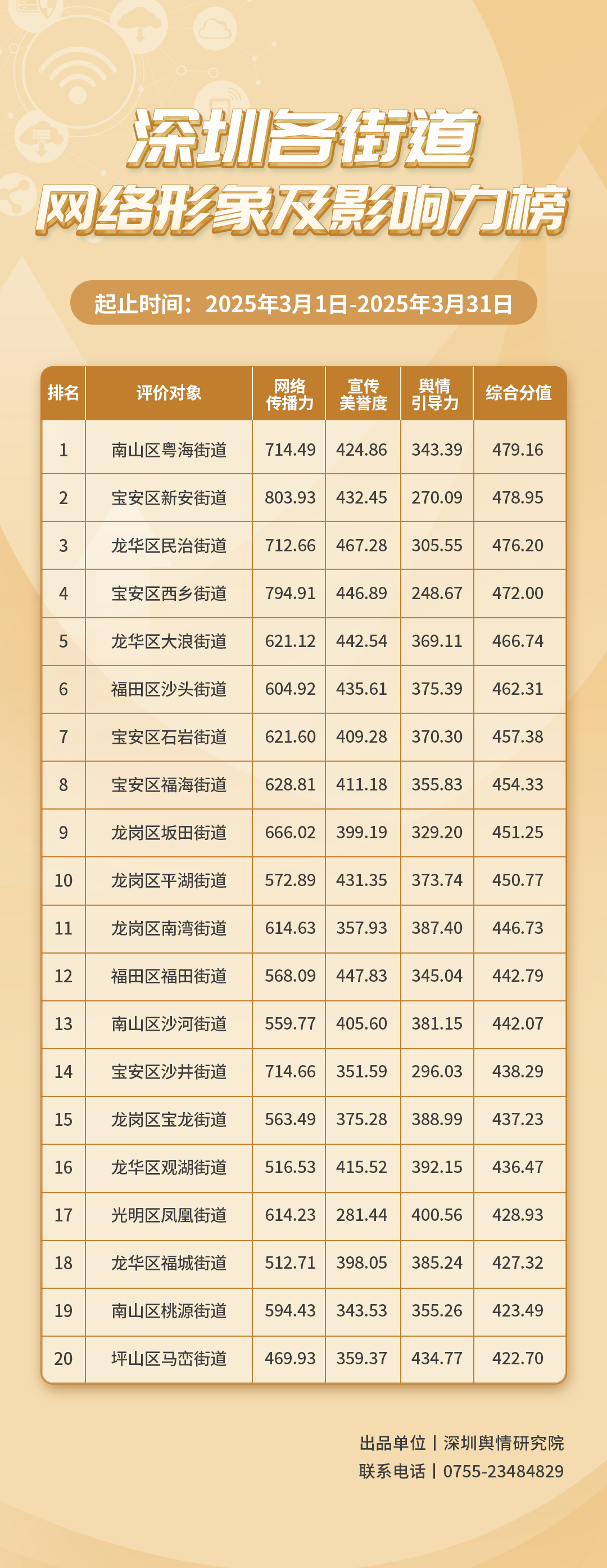 2025年3月,各街道緊扣網(wǎng)絡(luò)形象塑造的核心目標,精準發(fā)力,不斷拓展基層宣傳的輻射廣度與影響深度。《深圳各街道網(wǎng)絡(luò)形象及影響力榜》(3月榜單)評估街道在網(wǎng)絡(luò)空間的綜合表現(xiàn),為基層網(wǎng)絡(luò)形象治理提供參考。本期榜單數(shù)據(jù)統(tǒng)計范圍為2025年3月1日至3月31日。