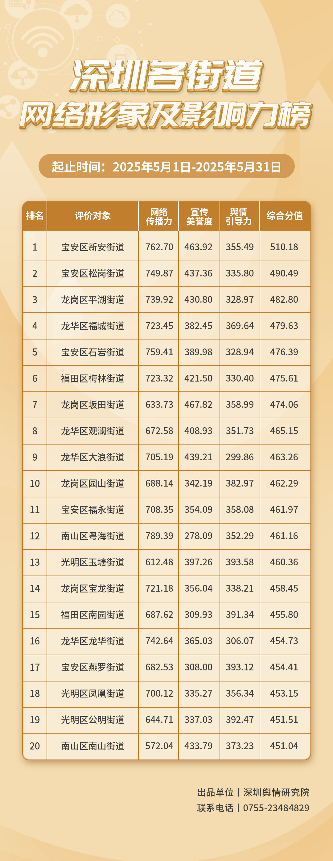 2025年,各街道積極探索網絡社交平臺的傳播特色,進一步深化完善基層治理。《深圳各街道網絡形象及影響力榜》(5月榜單)對各街道在網絡空間的展現及其影響力進行觀察與評估。本次榜單的數據統計時間跨度為2025年5月1日至5月31日。