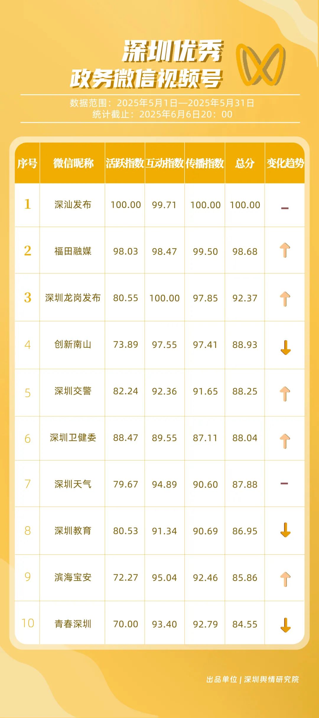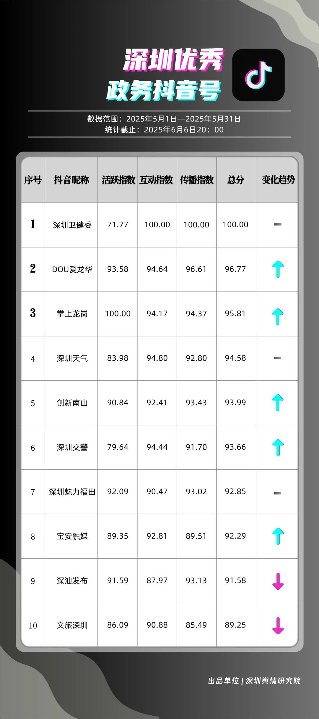 5月,“深圳衛(wèi)健委”“DOU愛龍華”“掌上龍崗”“深圳天氣”“創(chuàng)新南山”“深圳交警”“深圳魅力福田”“寶安融媒”“深汕發(fā)布”“文旅深圳”共10個政務(wù)抖音號獲得“優(yōu)秀政務(wù)抖音號”稱號。5月,“深圳衛(wèi)健委”憑借3條極具創(chuàng)意的視頻內(nèi)容持續(xù)收獲網(wǎng)民關(guān)注,穩(wěn)居榜首之位,成為政務(wù)抖音號領(lǐng)域的標(biāo)桿。“DOU愛龍華”“掌上龍崗”較上個月排名大幅度上升,以96.77分和95.81分位居榜單第2、3名,彰顯出積極探索創(chuàng)新傳播路徑、開拓政務(wù)短視頻發(fā)展新可能的決心。以上優(yōu)秀政務(wù)抖音號通過多樣化的短視頻形式傳遞政務(wù)資訊,為深圳政務(wù)新媒體在短視頻領(lǐng)域的蓬勃發(fā)展注入強勁動能,成為政務(wù)信息傳播的新標(biāo)桿。