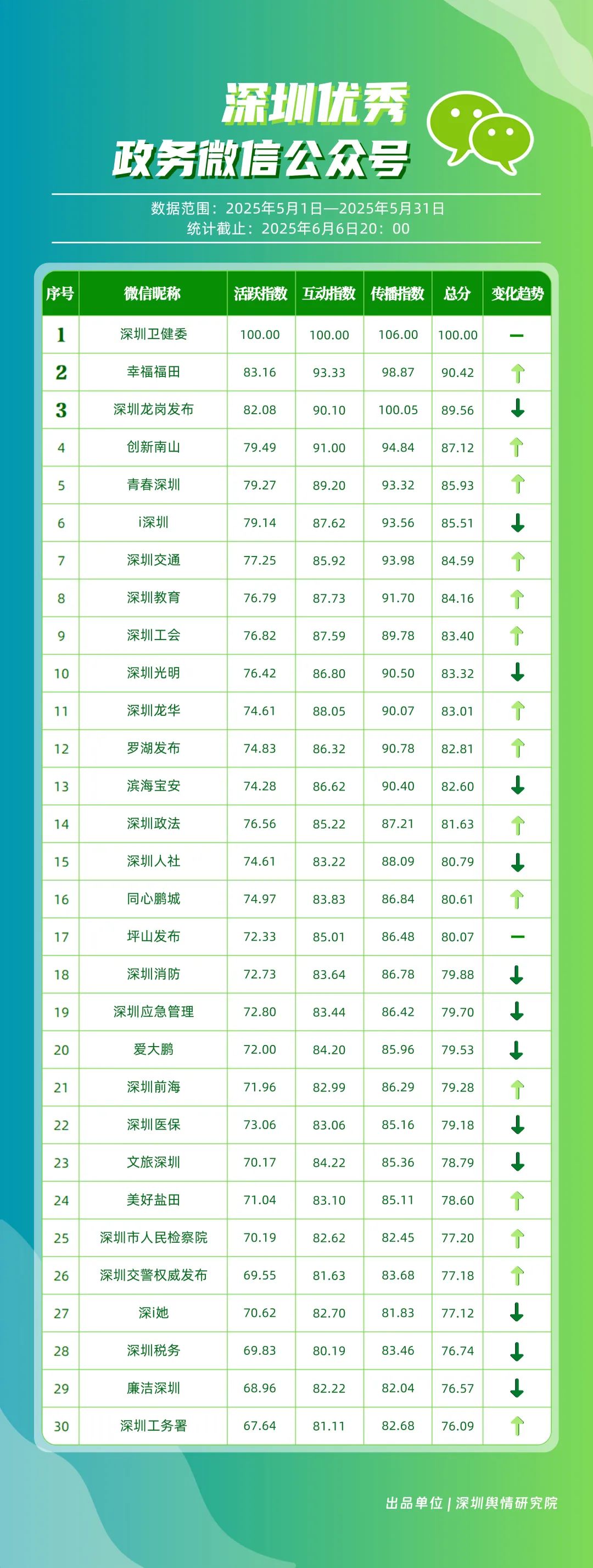 5月,30個政務(wù)微信公眾號入選“深圳優(yōu)秀政務(wù)微信公眾號”榜單,其中包括“深圳衛(wèi)健委”“幸福福田”“深圳龍崗發(fā)布”“創(chuàng)新南山”“青春深圳”“i深圳”“深圳交通”“深圳教育”“深圳工會”“深圳光明”等。其中,“深圳衛(wèi)健委”在活躍、互動、傳播3項指標(biāo)上獲得滿分,其亮眼數(shù)據(jù)彰顯了內(nèi)容創(chuàng)作的高質(zhì)量,位居榜單首位。“幸福福田”同樣表現(xiàn)出色,排名較上個月有所上升,以總分90.42的優(yōu)異成績位居榜單第2名;“深圳龍崗發(fā)布”“創(chuàng)新南山”“青春深圳”緊隨其后,以新穎的互動形式吸引用戶參與,表現(xiàn)值得肯定。上榜賬號充分發(fā)揮微信公眾平臺的傳播優(yōu)勢,以豐富多元的內(nèi)容形態(tài)、生動鮮活的表達風(fēng)格,持續(xù)為市民提供優(yōu)質(zhì)的信息服務(wù)。