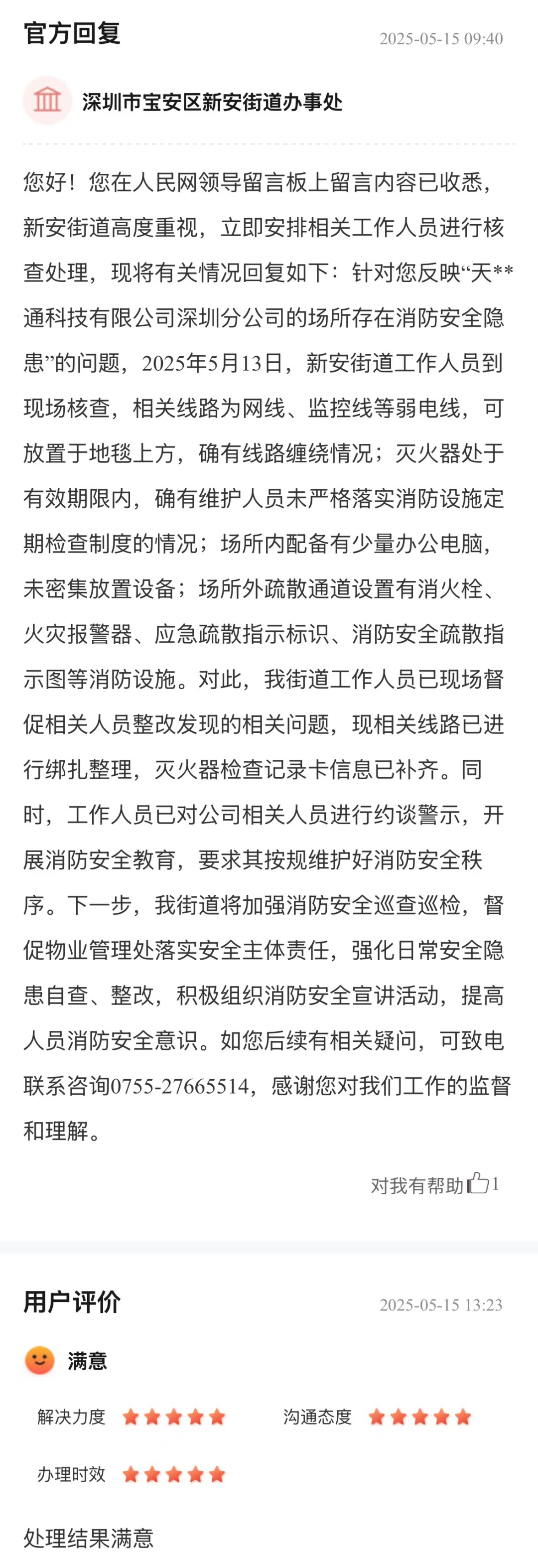 企業電氣線路混亂、滅火器維護缺位等消防隱患,直接威脅員工生命財產安全,更潛藏重大事故風險。街道辦收到市民反饋后,迅速核查并高效解決現存問題,以“即知即改”的行動力回應群眾關切。后續通過約談警示、安全宣教等舉措,從“治已病”轉向“防未病”,切實筑牢區域消防安全屏障,展現基層對安全隱患的快速治理能力,傳遞出“民生安全無小事”的責任擔當,獲得網民的五星好評。