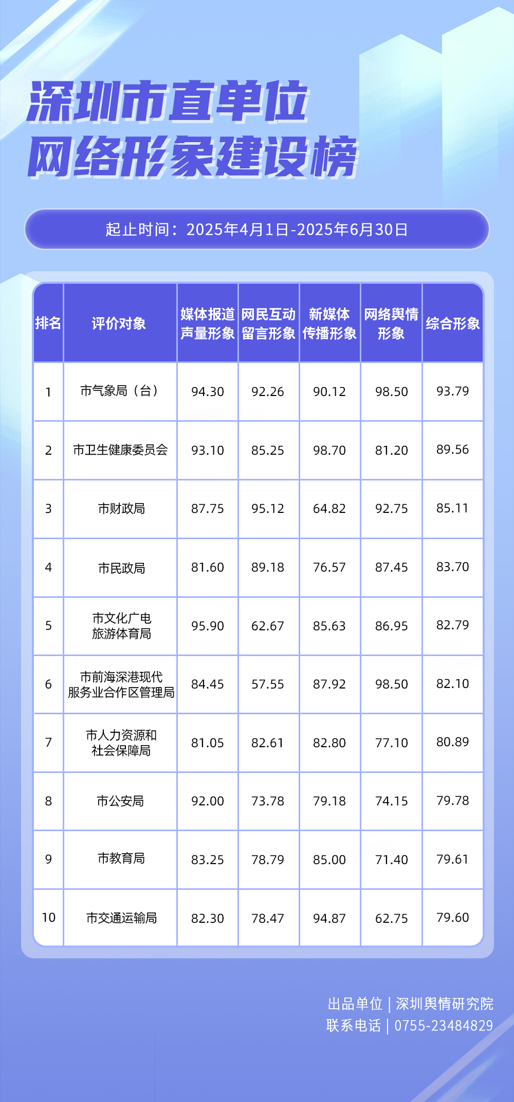 1.《深圳市直單位網絡形象建設榜》從深圳市直單位的媒體報道聲量形象(100分)、網民互動留言形象(100分)、新媒體傳播形象(100分)、網絡輿情形象(100分)四個維度展開綜合評價、計分排名,最終形成榜單。