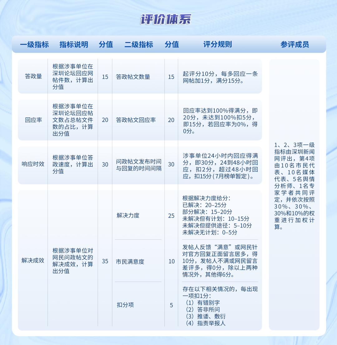 “問政深圳紅黑榜”具有科學、合理、完備的綜合評價體系,能夠綜合評估深圳各級黨政機關和公共企事業單位的答政情況。