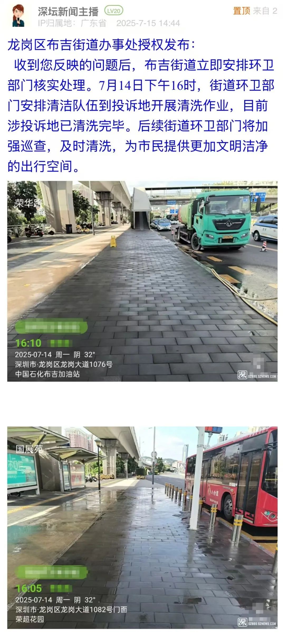 案例點評:對于市民反映的路面油污問題,布吉街道辦立即安排環衛部門進行清洗,并于第二日在問政帖文下進行回復,以現場圖片展示路面清理效果,表示將加強后續巡查。此次處置展現了基層部門高效務實的問題處理能力,為城市道路環境管理提供了快速響應與長效維護相結合的實踐范例,切實回應了市民對潔凈環境的期待。