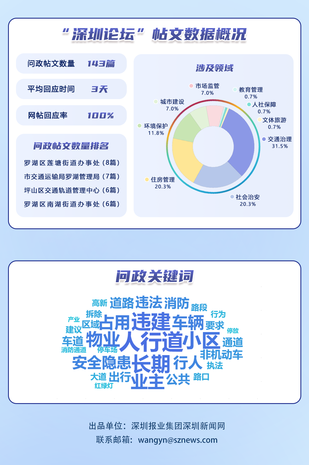 榜單帖文數據源自深圳論壇,均為網民點名希望涉事單位回應的網帖,共涵蓋68個單位、143篇網帖。所采集帖文發布時間為2025年7月1日至7月31日,采集截止時間為2025年8月15日。