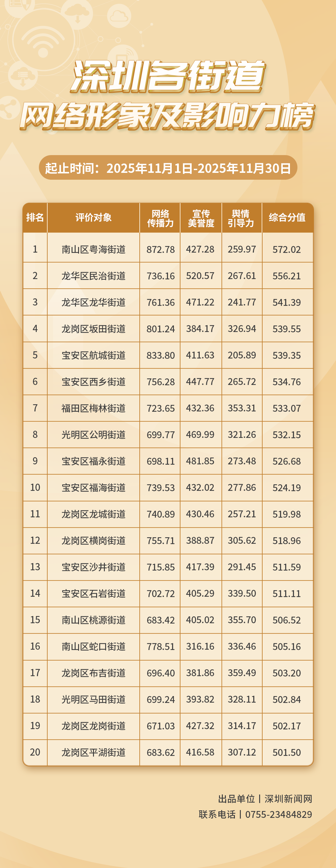 11月,各街道主動(dòng)深挖細(xì)研社交平臺(tái)傳播規(guī)律,全力推進(jìn)基層治理路徑的優(yōu)化升級(jí),拓展基層治理模式的落地空間,切實(shí)將社交平臺(tái)的傳播價(jià)值轉(zhuǎn)化為基層治理的實(shí)際效能。《深圳各街道網(wǎng)絡(luò)形象及影響力榜》(11月榜單)已編制完成,對(duì)各街道在網(wǎng)絡(luò)空間的展現(xiàn)及其影響力進(jìn)行了全面的觀察與評(píng)估。本次榜單的數(shù)據(jù)統(tǒng)計(jì)時(shí)間跨度為2025年11月1日至11月30日。